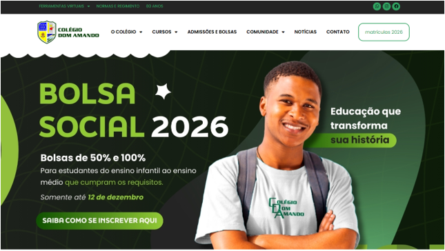 Em paralelo à campanha de matrículas para alunos pagantes, foi desenvolvida uma frente específica dedicada ao Programa de Bolsas Sociais 2026, com opções de 50% e 100%, reforçando o compromisso do Colégio Dom Amando com o acesso à educação de qualidade.
